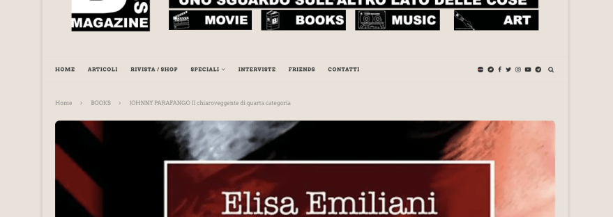 https://www.bsidesmagazine.com/books/johnny-parafango-il-chiaroveggente-di-quarta-categoria/?fbclid=IwAR0j47IJMSZoXBpXH-mIGX2PrRSU-hYpCuqk3Qn4nmMPFeaVFaNnoMEQCyM Grazie di cuore a Sergio Beccaria! E’ sempre un piacere leggere Elisa Emiliani e i borghi fatiscenti della campagna romagnola, con i suoi personaggi indimenticabili: beautiful losers anarchici, al limite della legalità, abbandonati a se stessi e travolti da eventi più grandi di loro.Come non lasciarsi affascinare dal cinquantenne Johnny Parafango, il chiaroveggente tatuato che legge Bakunin? Un chiaroveggente… Continua a leggere Una recensione di Johnny su Bsides magazine